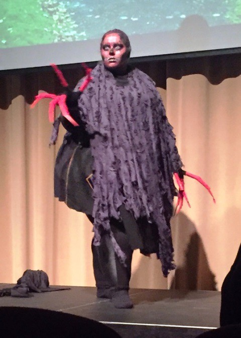 So let me describe a few of the evening’s highlights. An early favorite in the contest was The Ghoulish Wife. She appeared in black robes but then discarded these for what seemed to be a white wedding dress. During the changeover, she descanted a haunting melody in a lovely voice that must have been operatically trained. Another young female talent, Death, appeared in gory red and black grease paint, black robes, and donned some incredibly well-crafted ruler-length, red finger extensions, which Judge Jarrow described as looking like crab claws. Death recited a mournful elegy, but a little too softly, and thus earned scowls from the judges.